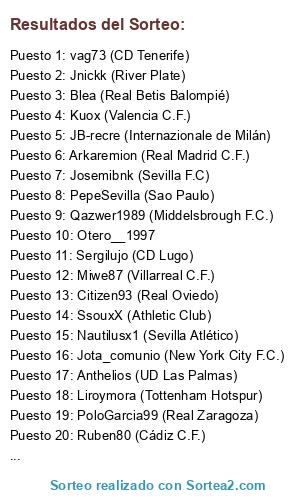Lista de participantes: Citizen93 (Real Oviedo), Trupho7 (TSV 1860 Munich), PoloGarcia99 (Real Zaragoza), Josemibnk (Sevilla F.C), Brujito (Málaga C.F.), Samugalego (RC Deportivo de la Coruña), SsouxX (Athletic Club), Nautilusx1 (Sevilla Atlético), MetraBC24 (AD Alcorcón), Xou86 (Besiktas JK), PepeSevilla (Sao Paulo), Jnickk (River Plate), Liroymora (Tottenham Hotspur), Otero__1997, Sanguangoo (Sassuolo), Erdin 87 (Liverpool F.C.), Ruben80 (Cádiz C.F.), Jota_comunio (New York City F.C.), Arkaremion (Real Madrid C.F.), pepe_el_profesor (Mnachester United), JB-recre (Internazionale de Milán), Patinohayna (Zenit San Petersburgo), Kuox (Valencia C.F.), Anthelios (UD Las Palmas), Pipoxarli, Sergilujo (CD Lugo), Miwe87 (Villarreal C.F.), Johnsmejias (Tigres), Arturoparaja (Real Sporting), Qazwer1989 (Middelsbrough F.C.), Blea (Real Betis Balompié), vag73 (CD Tenerife).