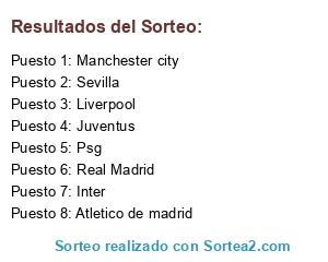 Lista de participantes: Atletico de madrid, Sevilla, Psg, Real Madrid, Manchester city, Juventus, Liverpool, Inter.