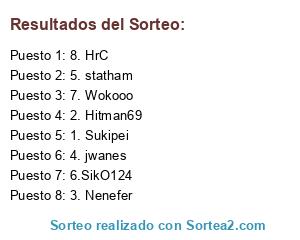 Lista de participantes: 1. Sukipei, 2. Hitman69, 3. Nenefer, 4. jwanes, 5. statham, 6.SikO124, 7. Wokooo, 8. HrC.