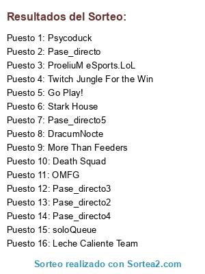 Lista de participantes: Death Squad, DracumNocte, Go Play!, Leche Caliente Team, More Than Feeders, OMFG, ProeliuM eSports.LoL, Psycoduck, soloQueue, Stark House, Twitch Jungle For the Win, Pase_directo, Pase_directo2, Pase_directo3, Pase_directo4, Pase_directo5.