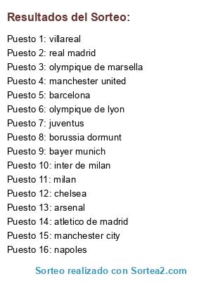 Lista de participantes: real madrid, barcelona, atletico de madrid, villareal, chelsea, arsenal, manchester city, manchester united, inter de milan, milan, juventus, napoles, bayer munich, olympique de lyon, olympique de marsella, borussia dormunt.