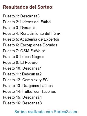 Lista de participantes: Renacimiento del Fénix, Complexity FC, OSM FutVelito, Dragones Latinos, Escorpiones Dorados, El Potrero, Dynamis, Lobos Negros, Academia de Expertos, Líderes del Fútbol, Fútbol con Tacones, Descansa1, Descansa2, Descansa3, Descansa4, Descansa5.