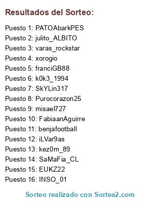 Lista de participantes: FabiaanAguirre, k0k3_1994, SaMaFia_CL, kez0m_89, varas_rockstar, misael727, julito_ALBITO, SkYLin317, benjafootball, iLVar9as, xorogio, Purocorazon25, PATOAbarkPES, EUKZ22, franciGB88, INSO_01.
