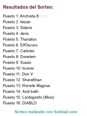 Lista de participantes: Anchoita 🐟, teizan, ticoner, Donelem, ElfOscuro, Rorrete Magnus, Don V, ShereKhan, Thanatos, Suazo, Lordogordo (Mino), Carlokio, Acid bath, deris, DIABLO, Sideris.