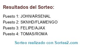 Lista de participantes: FELIPE/AJAX, JOHN/ARSENAL, SKNHD/FLAMENGO, TOMAS/ROMA.
