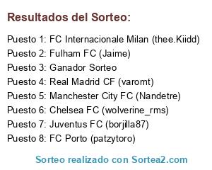 Lista de participantes: Chelsea FC (wolverine_rms), FC Internacionale Milan (thee.Kiidd), FC Porto (patzytoro), Real Madrid CF (varomt), Fulham FC (Jaime), Juventus FC (borjilla87), Manchester City FC (Nandetre), Ganador Sorteo.