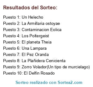 Lista de participantes: El Delfin Rosado, La Plañidera Cenicienta, La Armillaria ostoyae, El Pez Oranda, Los Poltergeist, Un Helecho, El planeta Theia, Una Lampara, Contaminacion Eolica, Zorro Volador(Un tipo de murcielago).