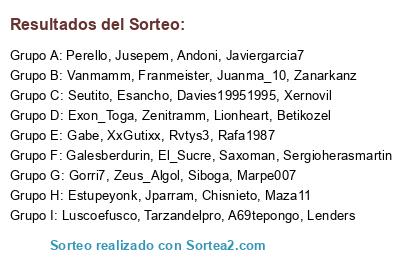Lista de participantes: Vanmamm, Marpe007, Maza11, Perello, Xernovil, Chisnieto, Rvtys3, Andoni, XxGutixx, Javiergarcia7, Juanma_10, Zenitramm, Luscoefusco, Tarzandelpro, Exon_Toga, Zeus_Algol, Lionheart, Sergioherasmartin, Siboga, Jusepem, Estupeyonk, Seutito, Lenders, Gorri7, Davies19951995, El_Sucre, A69tepongo, Esancho, Jparram, Gabe, Betikozel, Franmeister, Galesberdurin, Rafa1987, Zanarkanz, Saxoman.