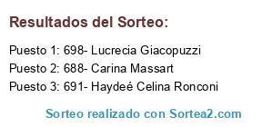 Lista de participantes: 683- Ma. Eugenia Apesteguía, 684- Miriam Andrea Martinez, 685- Rivolta Florencia, 686- Marcia Massart, 687- Caballero Liliana, 688- Carina Massart, 689- Ma. Soledad Sosa, 690- Ariela Luz Scola, 691- Haydeé Celina Ronconi, 692- Paola Doello, 693- Silvina Violláz, 694- Ma. Celeste García, 695- Miriam Murillo, 696- Mary Pancrazio, 697- Pierina Procura, 698- Lucrecia Giacopuzzi, 699- Ma. Laura Bibé, 700- Viviana Alvarez.