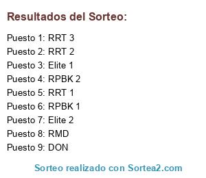 Lista de participantes: RRT 1, RRT 2, RRT 3, Elite 1, Elite 2, RPBK 1, RPBK 2, DON, RMD.