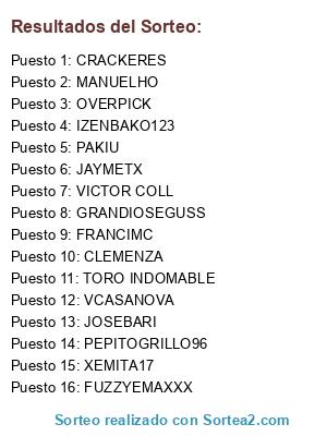 Lista de participantes: TORO INDOMABLE, MANUELHO, PEPITOGRILLO96, GRANDIOSEGUSS, JAYMETX, XEMITA17, PAKIU, CRACKERES, OVERPICK, FRANCIMC, CLEMENZA, FUZZYEMAXXX, IZENBAKO123, VICTOR COLL, VCASANOVA, JOSEBARI.