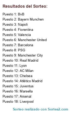Lista de participantes: Arsenal, Barcelona, Atlético Madrid, PSG, AC Milan, Lyon, Real Madrid, Chelsea, Manchester City, Juventus, Napoli, Marsella, Manchester United, BvB, Bayern Munchen, Liverpool, Fiorentina, Valencia.