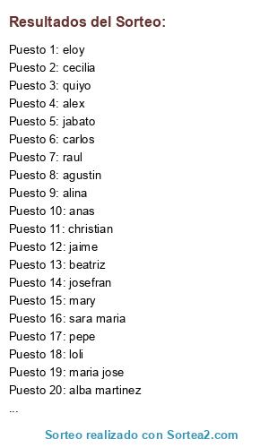 Lista de participantes: abel, abril, adrian, adriana, agustin, ainhoa, aitana, aitor, alba m, alba madero, alba maria, alberto, alberto g, alberto r, alejandro, alejandro l, alex, alex ro, alez sa, alicia t, alina, almudena, amelia, amie, ana, ana 2, ana g, ana s, anas, andrea m, andrea r, anna, antonia, antonio, ariadna, arianna, arsene lupin, aura, aurora, axel, ayla, ayla m, ayumi, bacterio, bart, basilio, beatriz, beatriz s, beatriz sa, bestiajez, blas, borja, cai, camelia, candela, carla, carlitos, carlos, carlos m, carolina, ceci, celia, celia g, celia l, celia s, cesar f, christian, chule, conan, cristina, dani, dario, david, davinia, diego h, eduardo, eduardo c, elena, eloy, epi, erik, erika, esperanza, esteban, esteban s, estefania, esther, esther n, estrella, felicia, felix, fernando, fernando l, fernando t, fernominer, fieroman, filemon, flora, francisca cristina, francisco finez, gabriel, gabriela, gema, generoso, georghita, gertomaner, gesterredo, godofredo, gonzalo, gorka, haibara, hugo, ibo, ignacio, imani, ines, inma, irache, irene, irene adler, irene s, ivan, ivan p, izan, jabato, jade, jaira, javier, javier r, jenniffer, jenny, jeremy, jesus, jesus manuel, jose antonio, jose antonio r, jose luis, josefran, juana, juanito, julia, julio cesar, just shut, kelly, kevin, lachlan c, laura m, leon de las flores, lidia, lisa, livvy, lizzy, loli, lorena, lorena f, lucia, lucia p, manuel ramon, maria a, maria angeles, maria del mar, maria dolores, maria jesus, maria jose, maria madrid, maria teresa, marina, marina r, mark, marta, marta 2, martin, mary, matilde, mazarro, miguel, miguel angel, milhouse, miriam, miriam 2, miriam d, miriam g, moriarty, mortadelo, nando, natalia, nobita, noe, noelia, noemy, nuria, nuria s, pablo, paco n, pedro, pepe, peter lawliet, petra, pilar, querubina, quiyo, rachel, rafael, ramón, raquel, raul, raul d, raul dr, raul n, reinoman, retomaner, ricky, risanor, roberto, rocio, rocio s, rodrigo, ruben, samantha, sammy, sancho, sandra, santi, santi r, sara, sara d, sara maria, savannah, selena, sergio, sergio s, sergio sa, sergio san, serromaner, sherlock holmes, shizuka, silvia f, sofia f, sofia t, stevie, suki, super, tahnny, tara, teresa, tyson, ursina, valentin, vanesa, victor, vidal, viola, virginia, walfredo, walter, zenon.