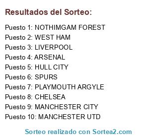 Lista de participantes: CHELSEA, LIVERPOOL, ARSENAL, MANCHESTER UTD, MANCHESTER CITY, PLAYMOUTH ARGYLE, NOTHIMGAM FOREST, SPURS, WEST HAM, HULL CITY.