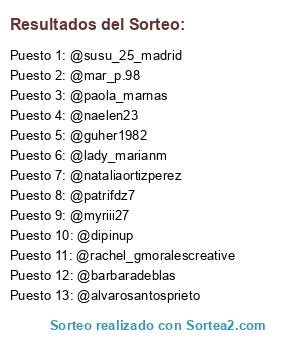 Lista de participantes: @guher1982, @barbaradeblas, @alvarosantosprieto, @nataliaortizperez, @rachel_gmoralescreative, @lady_marianm, @patrifdz7, @dipinup, @paola_marnas, @myriii27, @naelen23, @susu_25_madrid, @mar_p.98.
