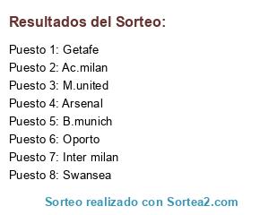 Lista de participantes: Oporto, Swansea, B.munich, Inter milan, Getafe, M.united, Arsenal, Ac.milan.