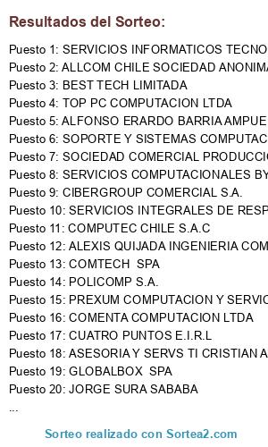 Lista de participantes: IGESTEC COMERCIALIZADORA LTDA, J&M SERVICIOS TI Y CABLEADO ESTRUCTURADO LTDA, MY TECH SPA, ICE CONSULTORES COMERCIALES LTDA, INGENIERIA Y CONSULTORIAS WEBREDES LTDA, SOCIEDAD EMPRESARIAL IT-GENERAL LTDA., ANDESCO SPA, PETA.CL SPA, R & C SERVICIOS COMPUTACIONALES LTDA., COMERCIALIZADORA SP DIGITAL LTDA, SERVICIOS INTEGRALES DE APLICACIONES TECNOLOGICAS LTDA, SEVEN SYSTEMS SOLUCIONES TECNOLOGICAS SPA, SOCIEDAD DE INGENIERIA ECHO LTDA, MAGENS S.A., PATRICIO RAMON CANOBRA ALVAREZ, WINPY SPA, COMPAÑIA DE COMPUTACION Y PROCESOS LTDA, COMERCIAL TOTALPACK, SOPORTE Y GESTION EN INFORMATICA LIMITADA, COMERCIAL 2050 SPA, CARLOS ANDRES NUÑEZ NUÑEZ, WUAPY S.A., IMPROMAC COMPUTACION LTDA, SERVICIOS INTEGRALES DE LOGISTICA Y LABORATORIO LTDA., SISTEMAX COMPUTACION LTDA., STM COMPUTACION LTDA., ASESORIAS INNOVAPLUS LTDA., DISTRIBUIDORA INFOR INGEN COMPUTACION LTDA, SOCIEDAD DE SERVICIOS COMPUTACIONALES Y DE OFICINA LTDA, JUAN CARLOS LAGOS CERDA, NET TRUST SERVICIOS Y CONSULTORIA SPA, SOC. COMERCIAL E INFORMATICA ORION SYSTEM LTDA, CONSULTIVA SPA., SERVICIO EN COMPUTACION INACOE LIMITADA, SERVICIOS Y TECNOLOGIAS CNT SPA, COMERCIAL E INDUSTRIAL INGTEC LIMITADA, COMERCIALIZADORA MD TECNOLOGIA LTDA, COMERCIALIZADORA NANCY DEL PILAR ACUÑA SANTANDER EIRL, SERVICIOS INFORMATICOS TECNOTECH LTDA., SOC. DE INVERSIONES TEKNOX S.A., ASINTEC SPA, VENTAS Y SERVICIOS FOTOGRAFICOS LTDA, IMPORT. Y SERV. ADVANCED COMPUTING TECHNOLOGIES S.A., CYC MARKETING Y PROMOCIONES S.A., CONSULTING SERVICES SA, GUILLERMO FERNANDEZ RAMOS, GLOBALBOX SPA, INGENIERIA Y TECNOLOGIA KROPSYS LTDA., RICARDO RODRIGUEZ Y CIA. LTDA., CAROLINA DEL PILAR CASTRO FIGUEROA, JAVIER ALEJANDRO MUÑOZ ALVAREZ, TECNODATA S A, ILLESCAS Y ORELLANA LTDA, COM Y SOL. INFOR.AREA PARTNER XOLUTIONS LTDA, COMERCIAL CONMIGO AHORRAS LTDA, SOC.DE SERVS.COMPUTACIONALES Y CAPACITACION M Y P LTDA., SERVICIOS Y COMPUTACION LTDA., JORGE EDMUNDO VERGARA ATHENS, COMERCIAL JORGE BRAVO EIRL, IMPORTADORA RM S.A., TECNOLOGIA LK SPA, COMERCIALIZADORA TECNOWORLD CHILE LTDA, FERNANDO GUTIERREZ JELVEZ COMPUTACION E.I.R.L., SOC.COMERCIAL NELSON ROJAS Y CIA LTDA, SERVICIOS INTEGRALES DE RESPONSABILIDAD LTDA, AVENDANO HERMANOS LIMITADA, JUAN RICARDO JARA CORTES, HCH CONECTIVIDAD Y REDES LTDA., SERTECO LTDA, KEPLER NOVA SPA, ELECTROCOM S.A., SISTEMAS COMPUTACIONALES Y TECNOLOGICOS LTDA., PRODATA S.A., COMPUTEC CHILE S.A.C, PROMOCENTER PUBLICIDAD LTDA., OS TECHNOLOGY LTDA, TICHILE LIMITADA, COMERCIAL INFOLAND LIMITADA, SOPORTE Y SISTEMAS COMPUTACIONALES LTDA, DIGIPLOT LTDA., COMPUTACION E INGENIERIA S A, IMPORTADORA Y COMERCIALIZADORA PAOLA ACEVEDO EIRL, COOP. AGRICOLA Y DE SERVICIOS LTDA, JUAN FRANCISCO CABRERA PARADA COMPUTACION EIRL, L Y M TECNOLOGIA LTDA., GUILLERMO GONZALEZ LTDA, SERVICIOS INFORMATICOS BARRA Y CIA. LTDA., J.P.M.A. INGENIERIA Y CONSTRUCCION LTDA., TRIO CONSULTING GROUP S.A., IBUSSMARKET SPA, ALFONSO DEL CARMEN CELEDON MUÑOZ, REPARACIONES BBCC LTDA., CBIZ S.A., REDES Y COMUNICACIONES LTDA., SOLUCIONES TECNOLOGICAS INTEGRALES LTDA, CRIMASEROS S.A., CIBERGROUP COMERCIAL S.A., SOLUCIONES INFORMATICAS AMERICANAS S.A., SANDOVAL Y MENDEZ LTDA., WEB CENTURY CHILE LTDA., PRIMATEC LTDA., IMPORTADORA MEDIALOGISTICS LTDA, COMERCIALIZADORA NOTEBOOKCENTER LTDA, DIMENSION S A, SOC.COMERCIAL SINTAS LTDA, TEXPRESS PRODUCTOS TECNOLOGICOS LTDA, INGENIERIA Y COMPUTACION GETECOM LTDA, SERVICIOS COMPUTACIONALES BYNARYA LTDA., CONTACTO INFORMATICA LTDA., NETGROUP CHILE LTDA., SOCIEDAD COMERCIAL TECNOVENTAS LTDA, TIBOX CHILE LTDA., MONICA NAVARRO KLENNER, CUATRO PUNTOS E.I.R.L, SOCIEDAD COMERCIAL PRODUCCIONES KOMA LTDA, INFORMATICA EXTERNA INFOEX LTDA., SUCESION JULIO ALBERTO SALINAS ALDANA, SALGADO Y CIA. LTDA., BARROS GOYCOOLEA Y CÍA .S.A, JAVIERA LAZO ULLOA, PREXUM COMPUTACION Y SERVICIOS LTDA, EVOLSYSTEM SPA, OFILINK COMERCIAL LIMITADA, TELECOMUNICACIONES Y REDES LTDA., FREDY RENE CARRERO SALVO, BYO ASESORIAS E INNOVACIONES COMPUTACIONALES, INTSERCOM LIMITADA, ASICOMP LTDA., FULL SUMINISTROS LTDA., NYTEC S.A., IMC SERVICIOS LTDA., VLADIMIR DELIC Y CIA LTDA, ASESORIAS, SERVICIOS Y TELECOMUNICACIONES LTDA., COMENTA COMPUTACION LTDA, NETLAN COMUNICACIONES LTDA, OS COMPUTACION LTDA, ASESORIA Y SERVS TI CRISTIAN ANDRES OYANADEL RIQUELME, SERVICIOS INTEGRALES EN COMPUTACION Y TRANSP .LTDA, LUIS ALBERTO URZUA SALVO, APRONTA LTDA, TACOTRONIX S.A., WEB FINANZAS S.A., FRANCISCO ANTONIO GODOY TARRAZA, FOCUS POINT EQUIPAMIENTO ECSENOTECNICO AUDIOVISUALES, JUAN RODRIGO RUBILAR OLAVE, INVERSIONES Y COMERCIALIZADORA CALVAREZ SPA, SC INFORMATICA LTDA., COMERCIALIZADORA CHILETECNOLOGICO LTDA, IMPORTADORA LILLO LTDA, SOLUCIONES GRAFICAS PEDRO JOSE BRAVO CASTILLO E.I.R.L., SOCIEDAD COMERCIAL A & C COMPUTACION LTDA, INGENIERIA, GESTION Y SOFTWARE LTDA., ASESORIA EN INFORMATICA MIGUEL GAMBOA RODRIGUEZ EIRL, CELESTRON LTDA., CHRISTIAN CORVALAN CORDOVA, PC EXPRESS COMPUTACION LTDA., F5 SOLUCIONES PEÑA LTDA, CONSULTORES MULTITECNOLOGICOS INFORMATICOS LTDA, PATRICIO FERNANDO LAGOS SOTO, FUAD VENEGAS RIADY Y CIA LTDA, RENZO DAVID FERRADA ALVAREZ, PROTAB S.A., JAVIER PARADA CASTILLO, COMERCIAL CDC LTDA, ARCU TECHNOLOGY LTDA., EMPRESA DE SOFTWARE RENDME LTDA, CLAUDIO BRITO GALLEGOS, CRISTIAN JAVIER RIOSECO INOSTROZA, CANADIAN LASER TECHNOLOGY S.A., RAIMUNDO HERNANDEZ Y CIA. LTDA., SOLUCIONES INTEGRALES SYSTECOMP SPA, SMARTPRO SERVICIOS PROFESIONALES LTDA, GROTHE Y FERNANDEZ LTDA., ALFONSO ERARDO BARRIA AMPUERO, SURIMED SPA, INVERSIONES SAN CRISTOBAL LTDA, INFO WORLD S A, TOP PC COMPUTACION LTDA, IPSTORE LTDA., SERVICIOS INFORMATICOS MAITE ZUÑIGA GAETE EIRL, COMERCIAL ALPHA INK LTDA., INGENIERIA Y SISTEMAS OPEN BUSINESS LTDA, THECOM SERVICIOS COMPUTACIONALES LTDA., RODRIGUEZ Y CIA. LTDA., OASIS TECNOLOGIA APLICADA LTDA, ENDIF TECNOLOGIAS LTDA., IXON TECHNOLOGY SPA, PRODUCTOS PARA LA INDUSTRIA GRAFICA LTDA., JUAN EDUARDO AREVALO GARCES, COMPUCENTRO COMUNICACIONES LTDA., ETRES SPA, ASESORIAS INFORMATICAS TYNFO LTDA, COLMAR TECNOLOGIA LTDA, POLICOMP S.A., SUPPLYLINE IMPORTADORA LTDA., 