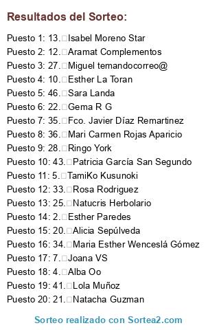 Lista de participantes: 1. Damaris Fuentes Lorenzo, 2. Esther Paredes, 3. Veronica Puig, 4. Alba Oo, 5. TamiKo Kusunoki, 6. Lorena Taborda, 7. Joana VS, 8. Montse Blázquez, 9. Pilar Alonso Losana, 10. Esther La Toran, 11. Ana Campillo, 12. Aramat Complementos, 13. Isabel Moreno Star, 14. Antonio Manuel Marti Garcia, 15. Emiliana Cabello Gómez, 16. Lola Muñoz Garcia Gasco, 17. Jose Antonio Alvarez Martín, 18. Maria José Alvarez Pérez, 19. Belen Fernandez, 20. Alicia Sepúlveda, 21. Natacha Guzman, 22. Gema R G, 23. Alicia Mendez, 24. Rosalía Puente Moya, 25. Natucris Herbolario, 26. Mª Esther Wencesla, 27. Miguel temandocorreo@, 28. Ringo York , 29. Carlos Polin, 30. Laura Vera, 31. David Saura, 32. Sara Garcia , 33. Rosa Rodriguez, 34. Maria Esther Wenceslá Gómez, 35. Fco. Javier Díaz Remartinez, 36. Mari Carmen Rojas Aparicio, 37. Gema Gonzalez García, 38. Jennifer Fernandez, 39. César San Felipe, 40. Ana Isabel Minaya, 41. Lola Muñoz, 42. Verónica Vinck, 43. Patricia García San Segundo, 44. Andrés Ramos Vazquez, 45. Begoña Fernandez, 46. Sara Landa , 47. Silvia L.C.