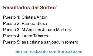Lista de participantes: Alexia, M Angeles Jurado Martinez, Laura Tabares, ana cristina sanjoaquin romero, cristina herrero, esther aznar, natalia natanata, Yolanda Planetaconpekes, M Eugenia Martinez, Mónica Carezgua, Susana Susi80, Patricia Blesa, Cristina Antón.