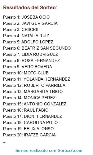 Lista de participantes: BONY SALCEDA, IRATZE GARCIA, MARIAN AMO, LIDIA RODRIGUEZ, ROBERTO PARRILLA, JAVI TORETE, OSCAR GARCIA, ANTONIO GONZALEZ, MOTO CLUB, BEATRIZ SAN SEGUNDO, CRIICRII, CAROLINA POLO , JAVI GER GARCIA, EMILIA RESCALVO, MONICA PEREZ, EDUARDO SIERRA, ANNA TORKY, NATALIA RUIZ, RAUL FABIO , DANI SANTOS , MARIAROSA VALDERRAMA, FELIX ALONSO, ANA RESINES, ROSA FERNANDEZ, DIONI FERNANDEZ, ADOLFO LOPEZ, JOSEBA OCIO, YOLANDA HERNANDEZ, MARGARITA TRIGO, VERO BOVEDA, SANDRA FRAILE.