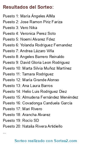 Lista de participantes: Lena Villa Posada, Belen Fernandez Candelas, Andrea Lázaro Viña, Patricia Martinez Vazquez, Dayana Silva, Raquel Mezquita, Beatriz González, Genti Alvarez, Paula Huelga, Marta Sánchez Pitiot, Ana Sanchez Pitiot, Aroa Garcia, Jose Manuel Alvarez Priede, Laura Peace, Lau López, Nancy Recio Muñiz, Marta Calviño, María Fanjul García, Helio Luis Rodriguez Diez, Veronica Perez Soto, Leandra Tardío Fiúza, Marisol Rodriguez del Rio, Patricia Garcia, Vanesa Marcos Martin, Arancha Alvarez, Natalia Caramelo Iglesias, Cristina Canteli, Cris Anit, María Sánchez Prado, Olaya Ferreiro Pacios, Fabio Eguía, Sheila Priego García, Sheila Fernández Fernández, Arancha Rodriguez Fernandez, Cristina Cortina González, Luisa Fuego Rodríguez, Irma Ruiz Menéndez, Veronica Alvarez Cimarra, Eva Mara Bosco, Carmen Llera Valdes, Eva Maria Juan Villarejo, Marta Redondo Casado, Katia Alonso García, Ari Ruiz, Mónica Barreiro, Mayte Blanco Alonso, Sonia Alvarez, Laura Suárez Pello, Blanca Prada Blanco, Talia Gonzalez, Marietel Fernandez, Lorena Contreras, Raquel Chacon Montiel, Verónica González López, Mari Luz Tuya Suarez, Soraya Macías, Inés Nogueira, Iris Fernandez Martinez, Marta Mendez Moris, Yolanda Rodriguez Fernandez, María Grande Alonso, Ana Laura Barros, Tatiana Rodriguez Quintana, Silvia Roy Mota, Carol Sáez, Covadonga Canduela García, Patricia Gonzalez, Noelia Rodriguez Gonzalez, Lucía TLaviada, Su CasaGcia, Sil Via Láctea, Isabel Martinez Puente, Juan Iglesias, Natalia Rivera Artidiello, Leticia Rodriguez, Marta Laiz, Jose Manuel, Clara Yo Misma, Veronica Vazquez Suarez, Verónica Carnero, Vero Nika, Tamara Rodriguez, Eliana Guerrero Pellico, Eva Fernandez, Patricia Álvarez Casado, Pilar Gárate, Noemi Alvarez Fdez, David Lopez Sastre, Pablo Alvarez Fernandez, Rocio Alonso Alvarez, Lucia Iglesias Rodriguez, Marisol García Linde, Mónica Álvarez, Noelia Alves Martínez, Beatriz Piñera Garcia, Bego Fernández, Angeles Barrero Reinaldo, Mari Rivero, Rocío SD, Benigno Alvarez Glez, Laura Fuente Magariños, Sandra Bravo Perez, Vane Fernández, Ana Bohio, Vane César, Joson Alonso, Celes Fdez, Ivan Mendoza, María Ángeles AlMa, Vanessa Rodriguez Salgado, Nuria Alonso, Noelia Barragán, Aaroa Pérez Salas, Jose Ramon Piriz Fariza, Luis Mariano Lazaro Valdes, Marta Silvia Muñoz Martínez, Susana González Vallina, Vanesa Gironda Rodriguez, Ángeles Fuente Alonso, Almudena Fernández Menéndez, David Gloria Leon Rodriguez, Lorena Alvarez, .