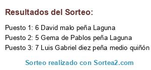 Lista de participantes: 1 Luis Miguel Prieto peña infierno, 2 Sheila shiovas peña infierno, 3 José Ángel García peña dando guerra, 4 David Rodríguez peña mendilibar, 5 Gema de Pablos peña Laguna, 6 David malo peña Laguna, 7 Luis Gabriel diez peña medio quiñón, 8 Adrian Alvarez Crespo peña medio quiñón, 9 Raul Aranda de Frutos peña medio quiñón.