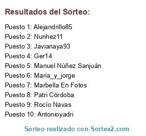 Lista de participantes: Fran Vecina, Fabio Salas, David García Sánchez, Marbella En Fotos, Rocío Navas, Patri Córdoba, Domingo Calvente Ocaña, Juan Antonio Rosa Sáchez, Manuel Núñez Sanjuán, Manuel Luque, Sergio Liguori, Nacho Martín Almansa, Bruno Bukinha, Salvador Moreno Benítez, Legorius98, Jgs1212, Daviddogger, Javianaya93, Aja_2707, Maria_y_jorge, Antonioyadri, Diegopuertar, Polenoso, Manuamaya80, Lopeziyo90, Antonio_gago_, Nachomartinn, LaBomby, PabloMR75, DiegoRubio22, Ger14, Miguelmf8, El_republican0, Nunhez11, Alejandrillo85, Cristianmeda, salvamarbella, Rokaya El Himli, AlfonsoJSanchez, .