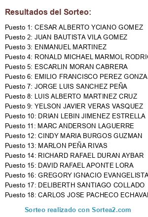 Lista de participantes: LUIS ALBERTO MARTINEZ CRUZ, MIGUEL ANGEL TREJO HERNANDEZ, GUILLERMO DELGADO CUSTODIO, EMILIO FRANCISCO PEREZ GONZALEZ, BLARELDYS TORRES REYES, JOSE MIGUEL COLON MUÑOZ, JORGE LUIS SANCHEZ PEÑA, ENMANUEL MARTINEZ, CARLOS JOSE PACHECO ECHAVARRIA, ELIEZER VERAS MONTERO, TAMAR COLON ALEJO, JUAN BAUTISTA VILA GOMEZ, CHRISTOPHER MICHAEL GUZMAN ACOSTA, HEIGAR ESEQUIEL JAVIER PICHARDO, GREGORY IGNACIO EVANGELISTA SANCHEZ, JEAN PIER UREÑA REYES, ALBERT MANUEL LUNA CORONA.