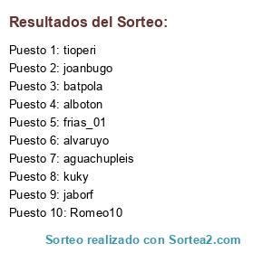 Lista de participantes: Romeo10, tioperi, joanbugo, frias_01, batpola, alboton, alvaruyo, jaborf, kuky, aguachupleis.