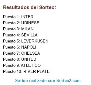 Lista de participantes: CHELSEA, INTER, UNITED, NAPOLI, RIVER PLATE, ATLETICO, UDINESE, MILAN, LEVERKUSEN, SEVILLA.