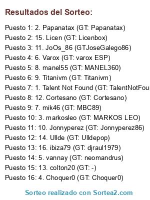 Lista de participantes: 1. Talent Not Found (GT: TalentNotFound), 2. Papanatax (GT: Papanatax), 3. markosleo (GT: MARKOS LEO), 4. Choquer0 (GT: Choquer0), 5. vannay (GT: neomandrus), 6. Varox (GT: varox ESP), 7. mik46 (GT: MBC89), 8. manel55 (GT: MANEL360), 9. Titanivm (GT: Titanivm), 10. Jonnyperez (GT: Jonnyperez86), 11. JoOs_86 (GTJoseGalego86), 12. Cortesano (GT: Cortesano), 13. colton20 (GT: -), 14. Ullde (GT: Ulldepop), 15. Licen (GT: Licenbox), 16. ibiza79 (GT: djraul1979).