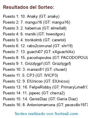 Lista de participantes: 1. Grizzlygpf (GT: Grizzlygpf), 2. habemus (GT: elmella8), 3. maniac81 (GT: chuset), 4. tronkolmb (GT: canetol), 5. CP3 (GT: IVICP3), 6. maniki (GT: howsitgon), 7. mangui16 (GT: mangui16), 8. Antoniomamona (GT: pececillo1977), 9. ElUnicoo (GT: ElUnicoo), 10. Anaky (GT: anaky), 11. jopeec (GT: cherra2), 12. rabo2comunal (GT: shr19), 13. guachi07 (GT: xXguachiXx), 14. GenisDiaz (GT: Genis Diaz), 15. pacodopoulos (GT: PACODOPOULOS), 16. FelipeRobby (GT: PrimaryLime813).