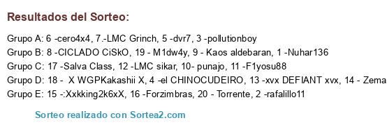Lista de participantes: 1 -Nuhar136, 2 -rafalillo11, 3 -pollutionboy, 4 -el CHINOCUDEIRO, 5 -dvr7, 6 -cero4x4, 7.-LMC Grinch, 8 -CICLADO CiSkO, 9 - Kaos aldebaran, 10- punajo, 11 -F1yosu88, 12 -LMC sikar, 13 -xvx DEFIANT xvx, 14 - Zemal, 15 -:Xxkking2k6xX, 16 -Forzimbras, 17 -Salva Class, 18 - X WGPKakashii X, 19 - M1dw4y, 20 - Torrente.