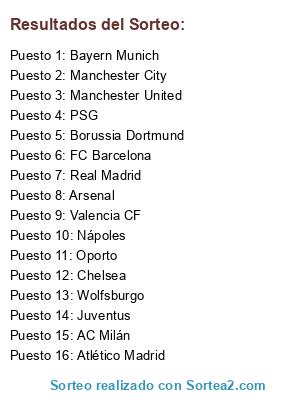 Lista de participantes: Arsenal, FC Barcelona, PSG, Wolfsburgo, Chelsea, Real Madrid, Juventus, Borussia Dortmund, Manchester City, Atlético Madrid, Nápoles, Oporto, Manchester United, Valencia CF, AC Milán, Bayern Munich.