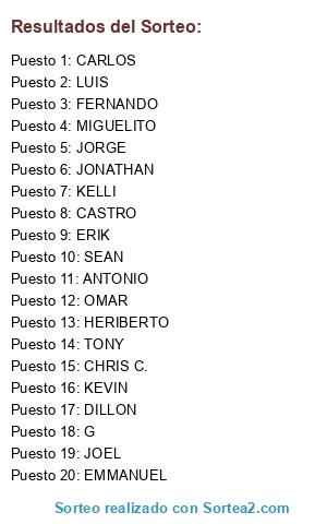 Lista de participantes: CASTRO, HERIBERTO, JORGE, G, JONATHAN, EMMANUEL, LUIS, KELLI, CHRIS C., SEAN, MIGUELITO, CARLOS, ERIK, TONY, FERNANDO, ANTONIO, JOEL, KEVIN, DILLON, OMAR.