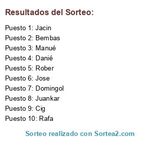 Lista de participantes: Bembas, Cig, Juankar, Jose, Rafa, Domingol, Jacin, Manué, Danié, Rober.