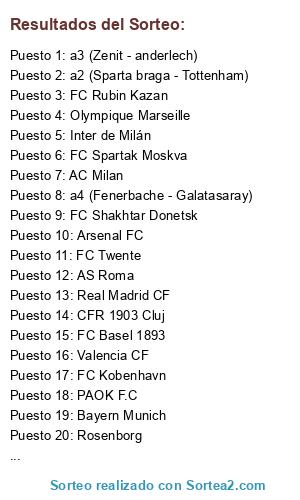 Lista de participantes: Inter de Milán, a1 (Sampordia - Werder Bremen), a2 (Sparta braga - Tottenham), FC Twente, Olympique Lyon, SL Benfica, FC Shalke 04, a3 (Zenit - anderlech), Manchester United, Valencia CF, Rangers FC, Rosenborg, FC Barcelona, Panathinaikos FC, FC Kobenhavn, FC Rubin Kazan, Bayern Munich, AS Roma, FC Basel 1893, CFR 1903 Cluj, Chelsea FC, Olympique Marseille, FC Spartak Moskva, a4 (Fenerbache - Galatasaray), AC Milan, Real Madrid CF, a6 (Dinamo kyiv - Ajax), AJ Auxerre, Arsenal FC, FC Shakhtar Donetsk, a5 (Sevilla - braga), PAOK F.C.