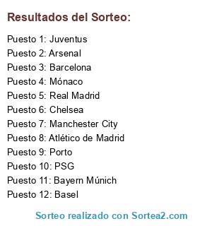 Lista de participantes: Juventus, Mónaco, Atlético de Madrid, Real Madrid, PSG, Barcelona, Porto, Bayern Múnich, Manchester City, Chelsea, Arsenal, Basel.