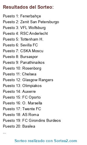 Lista de participantes: Twente FC, Tottenham H., Werder Bremen, Inter Milan, O. Lyon, Sevilla FC, SL Benfica, Schalke04, Manchester U., Valencia CF, Bursaspor, Glasgow Rangers, FC Barcelona, Rubin Kazan, FC Kobenhavn, Panathinaikos, Bayer Munich, Basilea, Sampdoria, AS Roma, O. Marsella, Chelsea, Rosenborg, Spartak Moscu, Real Madrid, Auxerre, AC Milan, Ajax, Arsenal, VFL Wolfsburg, RSC Anderlecht, SC Braga, FC Girondins Burdeos, FC Oporto, Olimpiakos, Zenit San Petersburgo, CSKA Moscu, Fenerbahçe, Galatasaray, Besiktas JK.