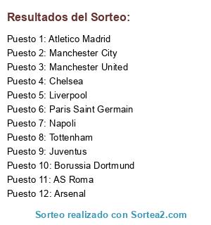Lista de participantes: Manchester United, Manchester City, Arsenal, Chelsea, Atletico Madrid, AS Roma, Liverpool, Paris Saint Germain, Juventus, Borussia Dortmund, Tottenham, Napoli.