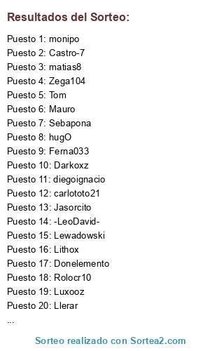 Lista de participantes: matias8, rapbyone, QuickSilver, Darkoxz, Parmenionx, Mauro, Jasorcito, millanes, The_Crack, Donelemento, hugO, Ricardinho, Didiersagb, monipo, Castro-7, Llerar, Ferna033, Luxooz, Pablopex, Tom, Zega104, -LeoDavid-, diegoignacio, Diegosilvaq, Sebapona, Lithox, H23, carlototo21, Lewadowski, Rolocr10, Inzaghideluxe, The tomas.