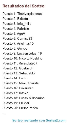 Lista de participantes: Fabrizio, Maxi_floresta, Carnisa93, Nico El Pueblito, ElLider, Mauromillo, ElPibePerico, Totolino, Exitista, Thepinkphanter, Sebapablo, Lauti, Gustavot, Intox2, PabloRiver19, Gringo, Lukariver, Riverplate07, AguV, Saanty, Nico River, Infa_millo, Lucasnicolas_19, Gonzo, Arielmas10, Jesu_14, Lucas Millonarioo, Theriverplatense.