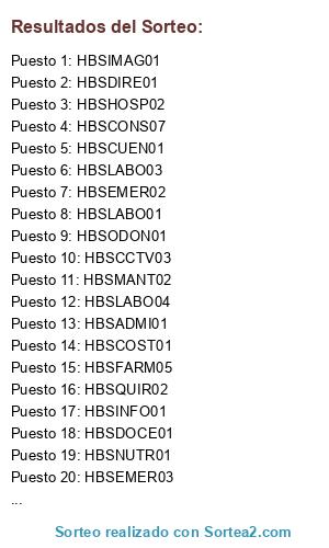 Lista de participantes: HBSADMI01 , HBSADMI02 , HBSADMI03 , HBSADMI04 , HBSADMI05 , HBSAUDI01 , HBSCALI01 , HBSCCTV03 , HBSCONS01 , HBSCONS02 , HBSCONS03 , HBSCONS04 , HBSCONS05 , HBSCONS06 , HBSCONS07 , HBSCONS08 , HBSCONS09 , HBSCOST01 , HBSCUEN01 , HBSDIRE01 , HBSDISC01 , HBSDISC02 , HBSDOCE01 , HBSECU911 , HBSEMER01 , HBSEMER02 , HBSEMER03 , HBSESCQ01 , HBSFARM01 , HBSFARM02 , HBSFARM03 , HBSFARM05 , HBSHOSP01 , HBSHOSP02 , HBSHOSP03 , HBSHOSP04 , HBSIMAG01 , HBSIMAG02 , HBSINFO01 , HBSLABO01 , HBSLABO02 , HBSLABO03 , HBSLABO04 , HBSLABO05 , HBSMANT01 , HBSMANT02 , HBSNUTR01 , HBSOBST01 , HBSOBST02 , HBSODON01 , HBSODON02 , HBSPREP01 , HBSQUIR01 , HBSQUIR02 , HBSSAUD01 , HBSTRAB01 , HBSTRAN01 , HBSTRIA01 , HBSTRIA02 , HBSTRIA03 , HBSTRIA04 , HBSTTHH01 , HBSTTHH02.