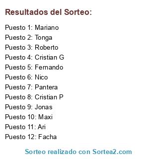 Lista de participantes: Nico, Tonga, Fernando, Roberto, Cristian P, Mariano, Maxi, Jonas, Cristian G, Pantera, Ari, Facha.