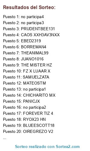 Lista de participantes: THE MISTER HZ, MATEOSTM, CLOTHINGWINGS75, THEANIMAL99, POPEYEDPIT6228, JUANO1016, CAOS XXH3AV3NXX, BORREMAN4, PRUDENTBEE131, CHICHARITO MX, FOREVER TIZ 4, PANICJX, OOSORNIO23, OlREGREZO V2, LEOS96, FZ X LUAAR X, BLUEESCOTT18, EBED2319, SAMUELZATA, RYOX23 HN, no participa1, no participa2, no participa3, no participa4.