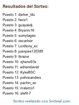 Lista de participantes: darker_ldu, guayasdj, favix1, pachin_ec, oscarloor, Bryanrc16, KykeBSC, Lordtony_ec, tkrazor, xjhano93x, juanjose120389, sumytageo, adriandaviid, polivioandres, mslarco1, alefit-7.
