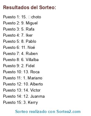 Lista de participantes: 1. Mariano, 2. Fidel, 3. Kerry, 4. Ruben, 5. Rafa, 6. Villalba, 7. Iker, 8. Pablo, 9. Miguel, 10. Alberto, 11. Noé, 12. Juanma, 13. Roca, 14. Victor, 15. choto.