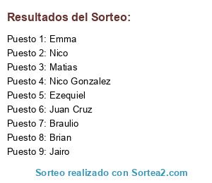 Lista de participantes: Braulio, Ezequiel, Juan Cruz, Emma, Nico, Jairo, Matias, Brian, Nico Gonzalez.
