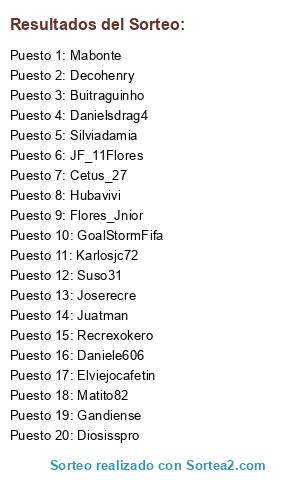 Lista de participantes: Karlosjc72, Flores_Jnior, Cetus_27, Hubavivi, Silviadamia, GoalStormFifa, Diosisspro, Joserecre, Juatman, Mabonte, Matito82, Danielsdrag4, Elviejocafetin, JF_11Flores, Daniele606, Gandiense, Recrexokero, Buitraguinho, Decohenry, Suso31.