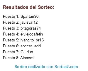 Lista de participantes: javisval12, pitagoras74, Spartan90, Aloxemi, ivancito_br16, elviejocafetin, Gl_dux, soccer_adri.